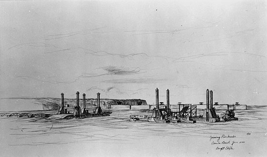 A Loebnitz pierhead, just arrived by tow from Portsmouth, England, was joined to those already in place at the end of a pontoon causeway. It drove its 'spuds" to the bottom and formed part of a platform from which LSTs could discharge from both upper and lower decks. In the background is Pointe du Hoe, and the western shore arm of the concrete breakwater.