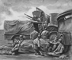 By the time General Eisenhower's message, which began, "You are about to embark on a great crusade " had been distributed, the great armada set in motion and headed for various rendezvous areas. The ungainly ships crowded the stream and their loudspeakers blared forth swing music across the quiet water, sound which echoed strangely in the peaceful old villages and the hills which hemmed it in. As soon as the ships were clear of the port, the men tried to relax, some gathering in little groups to try to forget the inevitable end of the voyage by talking and companionship. Others, preferring to be alone with their thoughts, just sat and looked out to sea. The ship was fully loaded at the time and all were in what was called a "sealed" status, which meant that no one was permitted to leave the ship at all, even on minor errands. Having just arrived from the station, the artists feelings were a mixture of both a recognition of the now familiar patterns of amphibious invasion and that sense of unrealness brought about by such a sudden change.