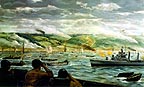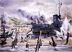 The house in the valley and the spire of Colleville-Sur-Mer on the Hill were landmarks of Fox Green Beach. Germans used the spire for an artillery control tower, with spotters able to see the full panorama of the American forces and direct artillery fire at opportune targets. The churchs lovely renaissance architecture crumbled into sad rubble when a U.S. fire-control party on the beach called on the destroyer U.S.S. Emmons to demolish it. The artist was serving as an identification officer aboard that ship. This was the beach which Hemingway described in his article "Voyage to Victory."
